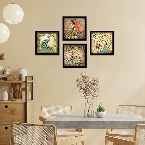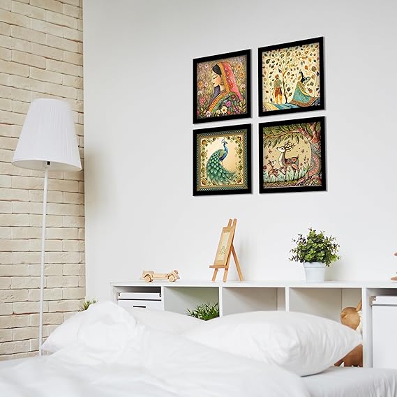 Madhubani Art Framed Painting For Home, Living Room, Hall | Traditional Rajasthani Pichwai Art Paitnings With Frame For Home Decor (Set Of 4)
